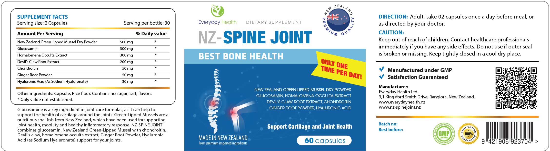 NZ-Spine Joint contains the following ingredients:Mussel, Glucosamin, Homalomena occultra, Devils claw, Chondroitin, Ginger, and Hyaluronic acid.